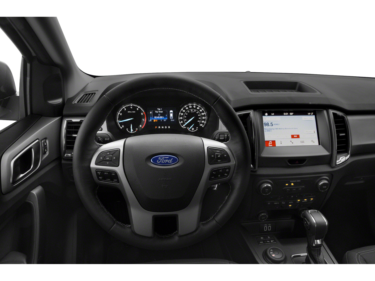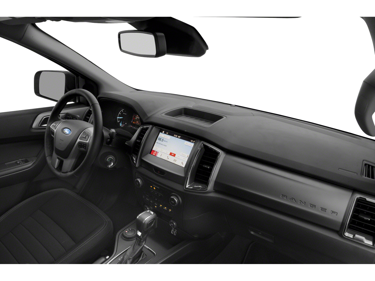 Inside, the Ranger XLT pampers you with premium features like a Leather-Wrapped Steering Wheel, Auto-Dimming Rearview Mirror, and a 110V AC Power Outlet for your on-the-go needs. The Reverse Sensing System adds an extra layer of convenience and safety when maneuvering in tight spaces.